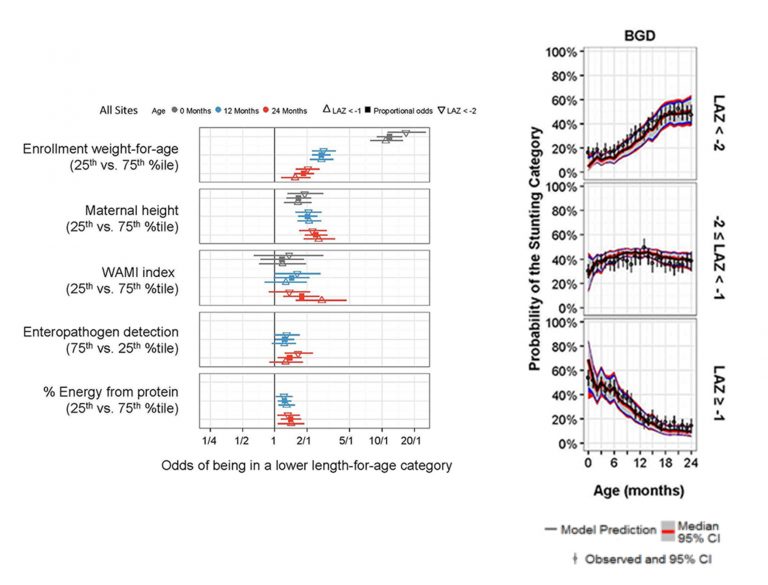 As an example, an previous ki models have defineda categorical outcome variable for length-for-age-zscore (LAZ) where participants were defined as being stunted if LAZ < -2, at-risk for stunting if LAZ was between -2 and -1, and not stunted if LAZ ≥ -1. LAZ was regressed on continuous and categorical variables including age, mother’s height, presence of enteric pathogens in stool, % energy from protein, enrollment LAZ and other important variables.[4] In Figure 1(upper panel), LAZ values have been color-coded to represent the 3 categories: stunted, at-risk for stunting, and not stunted.At age 0 Months, we had 37 infants below -2 (green points) from the total of 230 infants (shown in gray). This translates to the 16% shown age 0 Months in the lower panel of Figure 1. The probability of being stunted (LAZ < -2) is increasing over time (follow the green line).